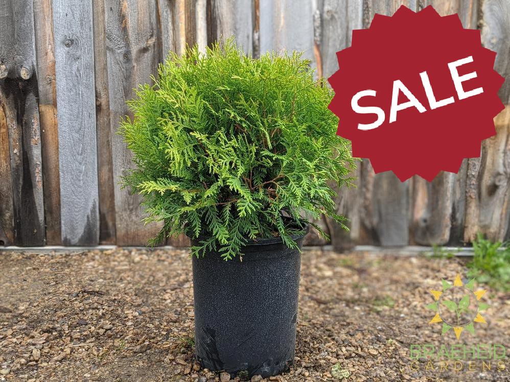 Natural globe cedar with rich flat sprays of aromatic, soft green dense foliage with small brown cones. Low maintenance border or foundation plant. Needs regular deep watering during growing season.