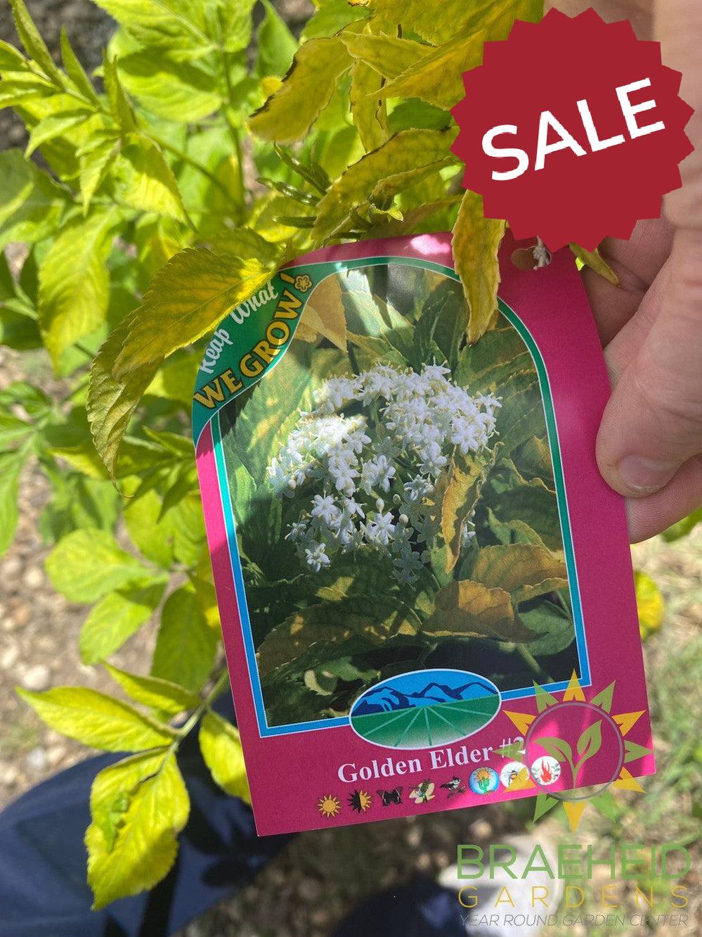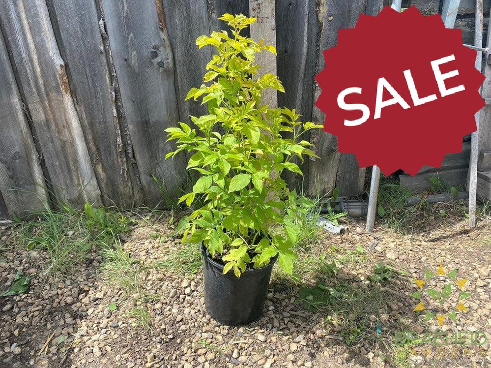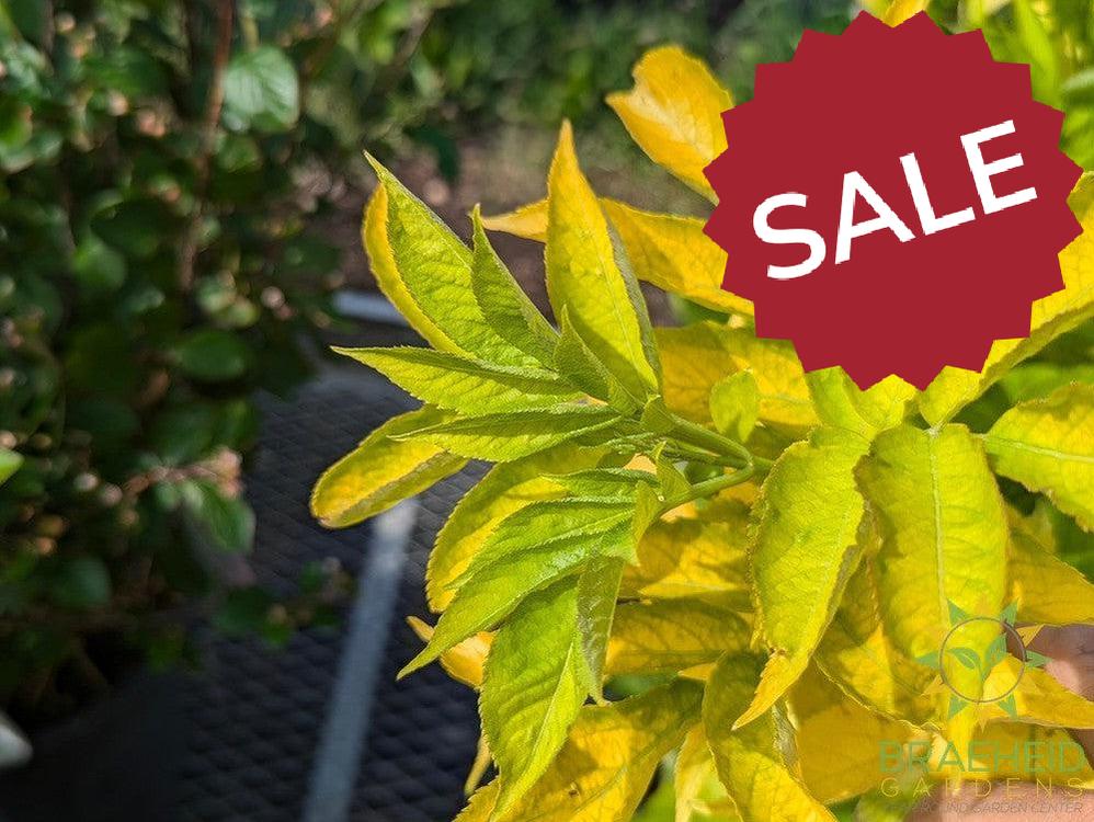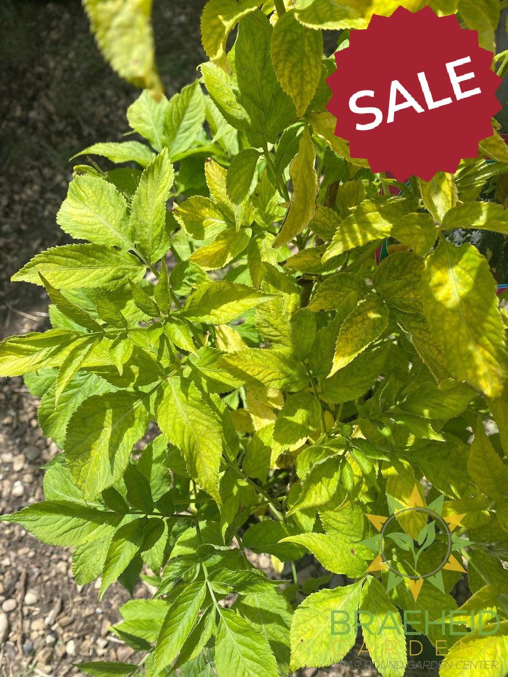 Fast growing contrast shrub. Bright yellow foliage is best in full sun. Large clusters of tiny white blooms in spring and small ornamental black berries in fall. Prefers a moist to wet, well-drained soil. Drought tolerant once established.