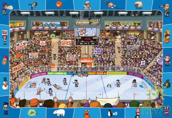 Lots of fun happens at the hockey game, but you'll have to look carefully to make sure you don't miss any of it. This unique spot & find game adds to the fun of a jigsaw puzzle by challenging kids to find hidden items inside the picture.