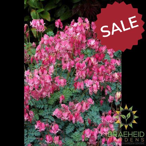 Long blooming, dangling pink-red heart-shaped blooms on blue-green ferny foliage. Blooms from mid-summer to early fall. Deadhead for rebloom. Prefers a moist, well-drained soil. Shade loving. Use for edges and containers
