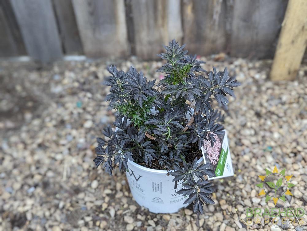 Columnar form with black-purple, deeply dissected foliage highlighting soft pink-white bloom clusters starting in late spring. Strong, straight and low maintenance stems. Blooms mature to red-black ornamental fruits in late summer. Prefers a moist, well-drained soil.