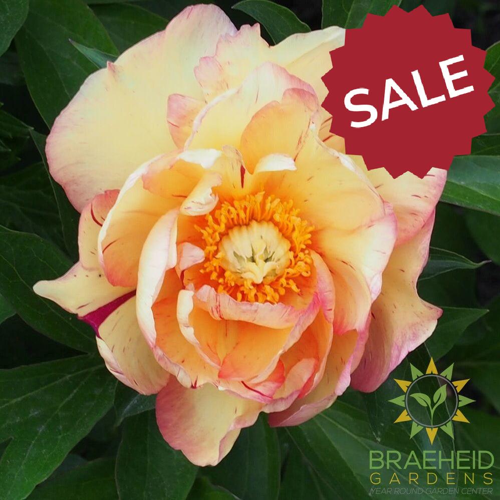 Large, semi-double yellow blooms develop splashes of purple as they mature. Blooms from late spring to early summer on strong stems (no staking required) atop long, dark green foliage. Tolerates drought once established in a moist, well drained soil.