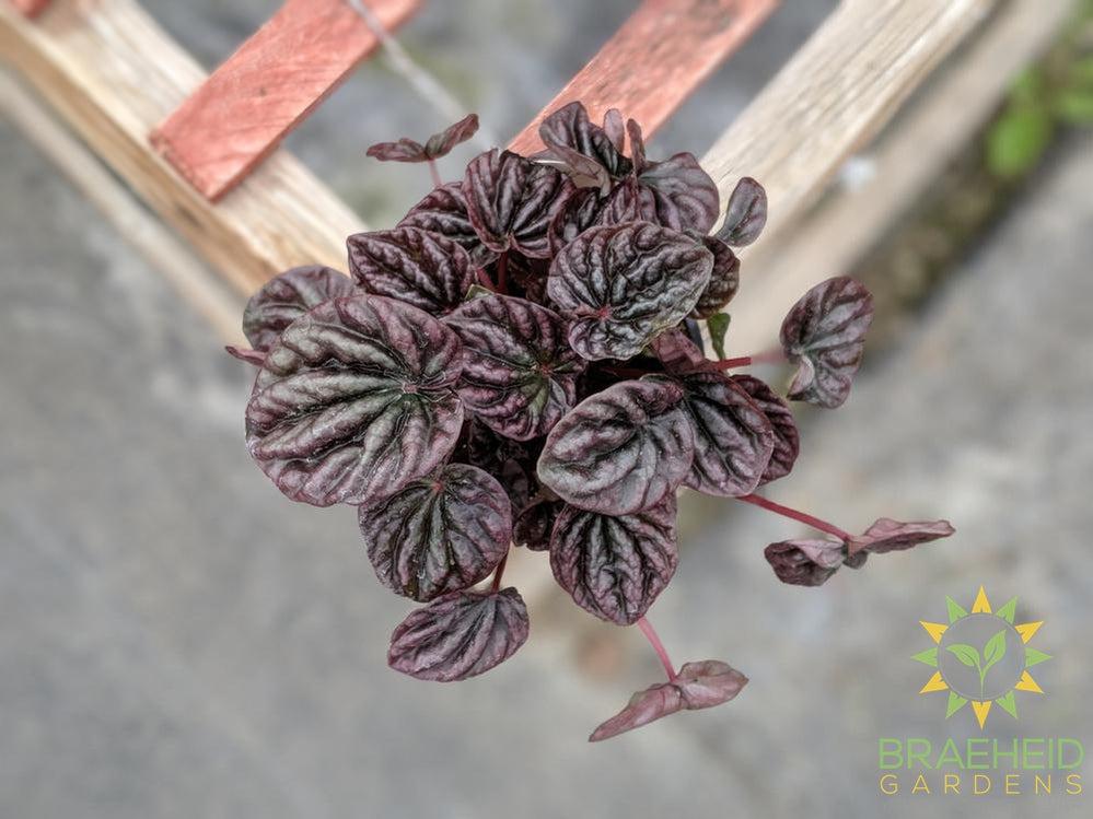 A stunning,ย Metallic redย Peperomia with a deep intricate textured leaf.