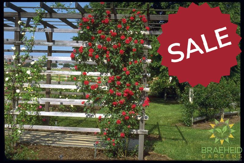 Climbing rose smothered in true red, fully double, recurrent fragrant blooms on strong canes. New burgundy foliage matures to glossy, dark green. Resistant to powdery mildew and black spot. Prefers a moist, well-drained soil. Drought tolerant once established.