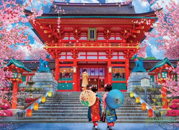 This stunning 1000-piece Eurographics puzzle, "Spring Sakura" by Lars Stewart, transports you to a vibrant springtime scene in Japan. The magnificent image features an ornate traditional temple, bathed in brilliant red and intricate architectural details, surrounded by an explosion of delicate pink cherry blossoms. Two figures, elegantly dressed in traditional attire and holding parasols, ascend the grand stone steps, adding a sense of peaceful movement to the serene landscape.