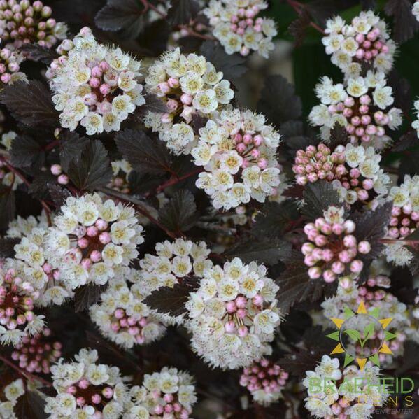 Dwarf ninebark with spectacular pink-white blooms all along branches in late spring. Blooms are highlighted by dark, bronze-maroon, compact foliage. Holds colour all season long. Adapts to many soil types and drought tolerant once established. Asexual propagation prohibited.