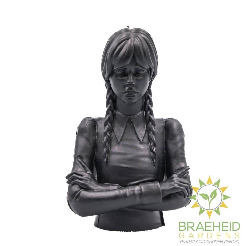 Inspired by the beloved Addam’s Family character, this Wednesday candle is both expressive and eerie. Add this unique Wednesday candle to your scary décor this autumn season. The perfect gift for a fan of the Addam’s Family or Wednesday series. Available in black.